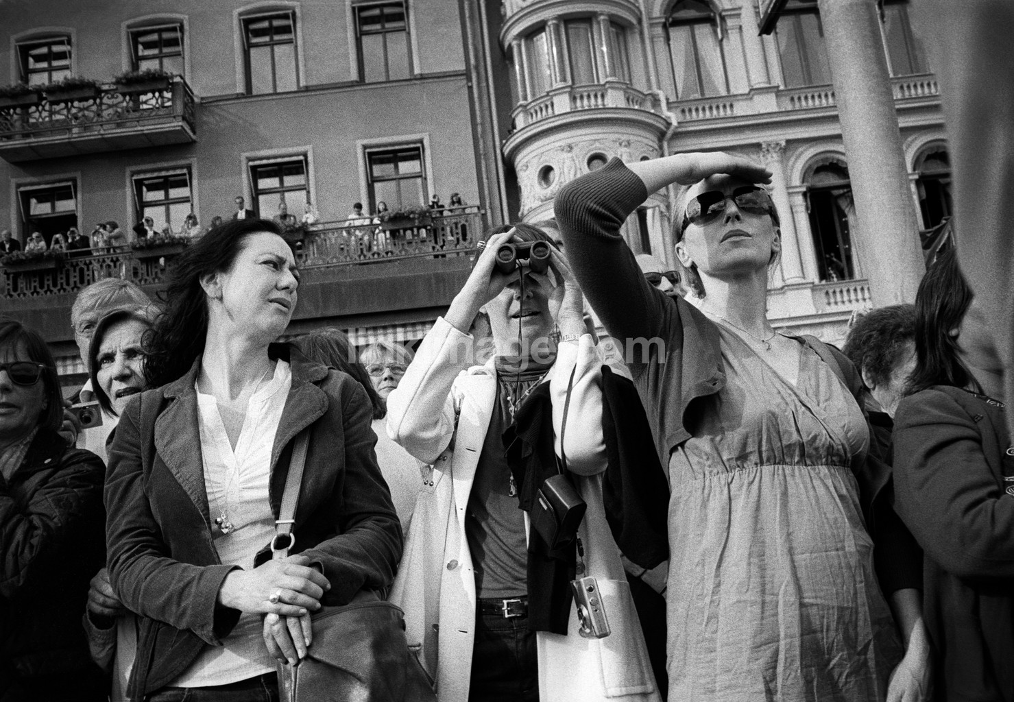 - people, crowd, scouting, watch, peeking, binoculars, balcony, event, celebrate