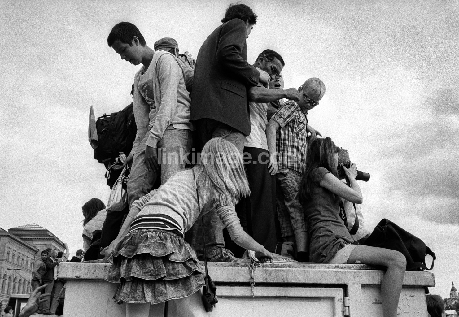 - girl, climb, height, box, crowd, look out, watch, camera, photograph, congestion