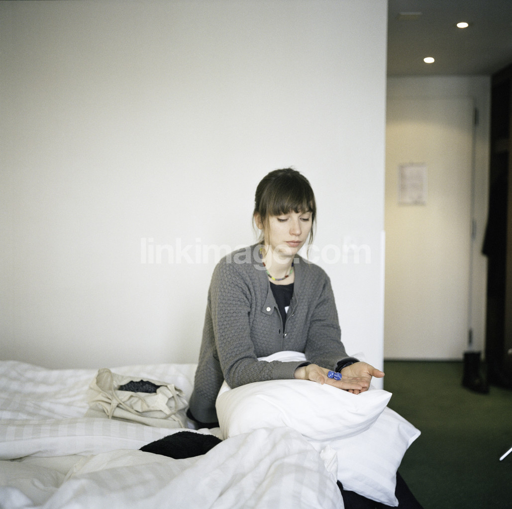 girl, female, brunette, bangs, bed, quiet, sit, room, cushion, hands, hold, dice, cubes