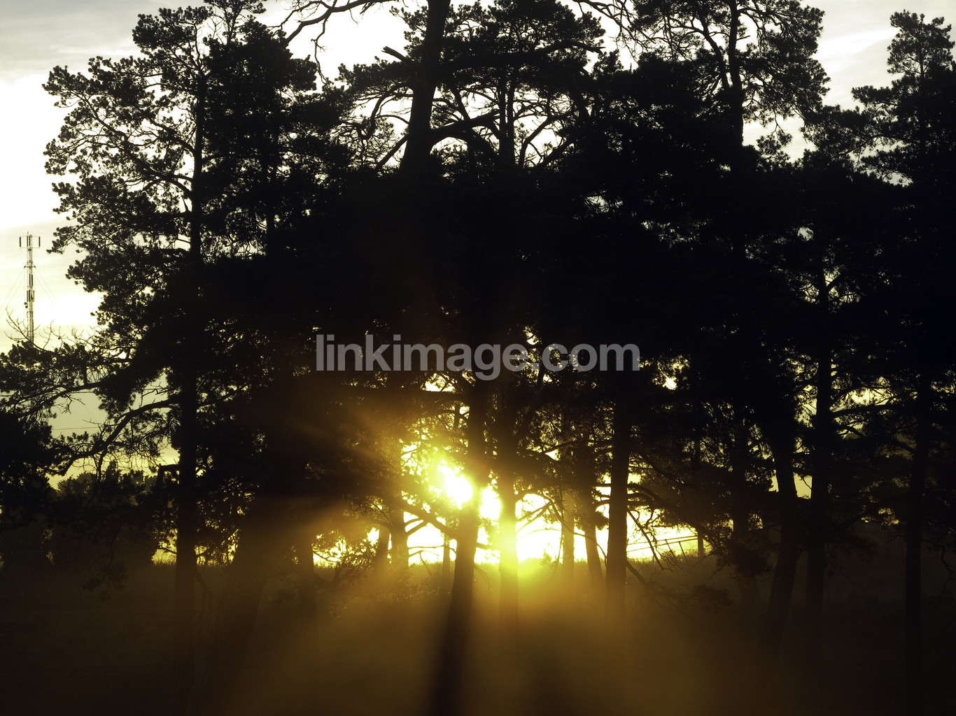 - forest, dawn, sun, sunrise, light, tree, radio tower, mast, backlight
