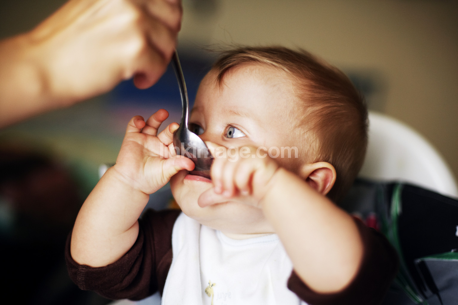 baby, eat, food, spoon, gaze, hands, arm, fingers, face, feed, parent, children, family