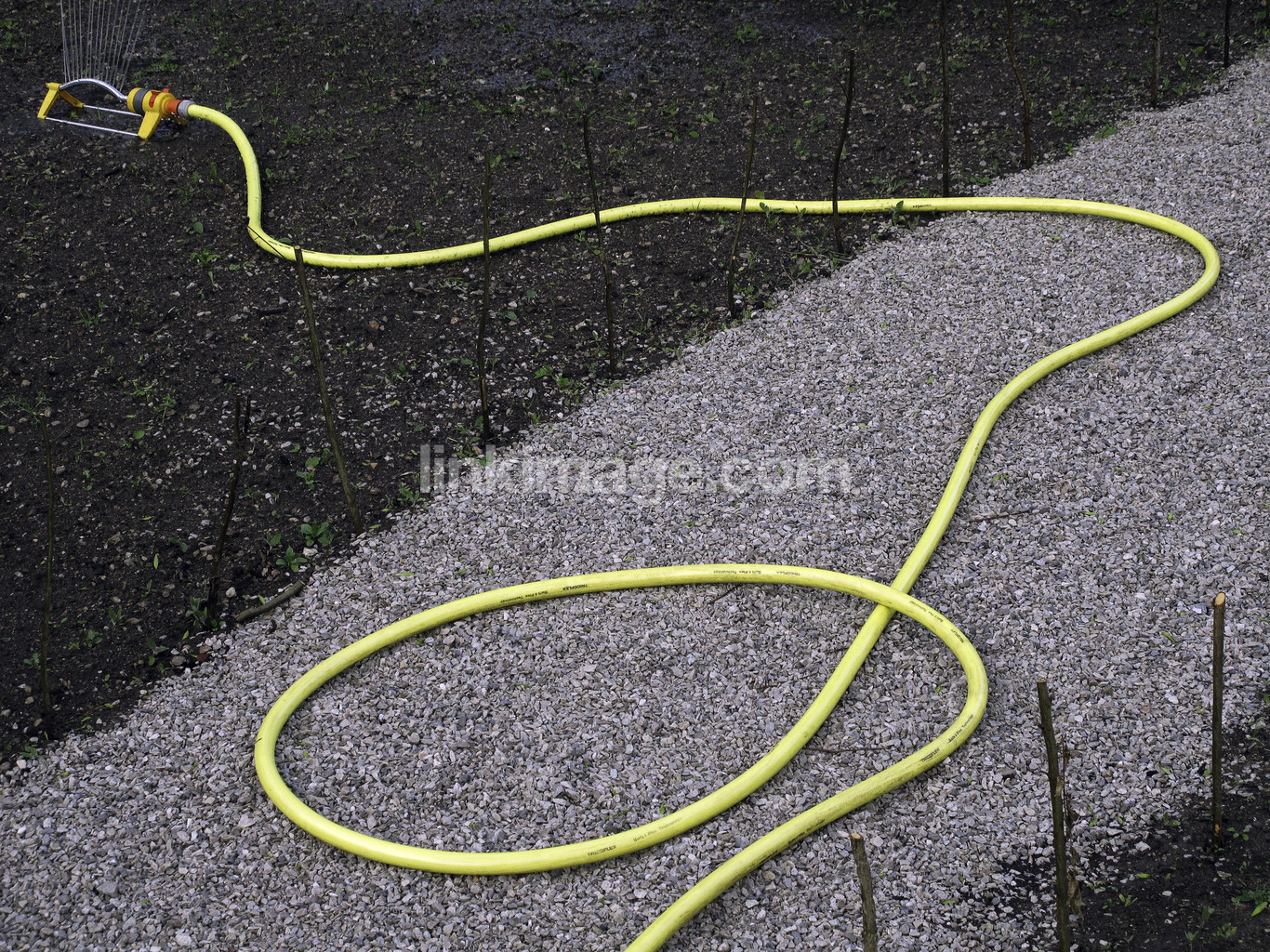 - hose, garden hose, irrigation, growing, garden, grusgång, plant, irrigate, sprinklers, yellow, form, gravel