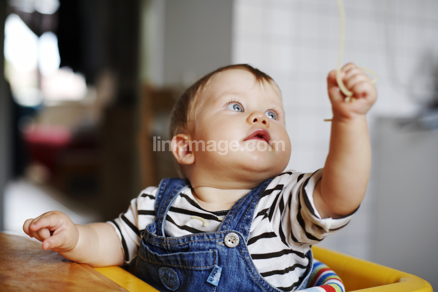 baby, food, eat, kitchen, table, play, spaghetti, hand, grip, head, capture, gaze, eyes, see, children