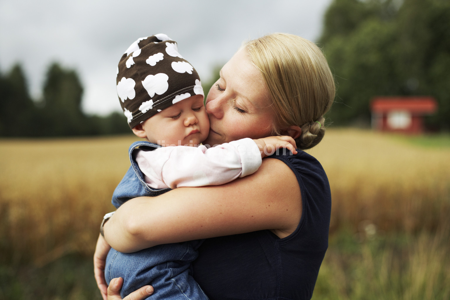 baby, mother, hugging, cuddle, close your eyes, love, family, cap, field, house, grain, wheat, barley, puss, kiss, summer, arms, female, tenderness, proximity