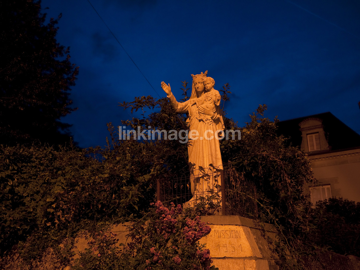 madonna, sculpture, statue, wall, blue, yellow, sky, house, garden, night, lit, park