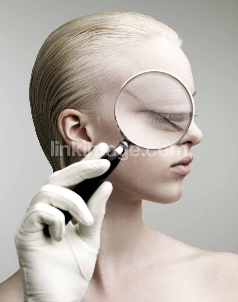 - head, portrait, hand, profile, face, eye, magnifying glass, female, girl, skin, glove