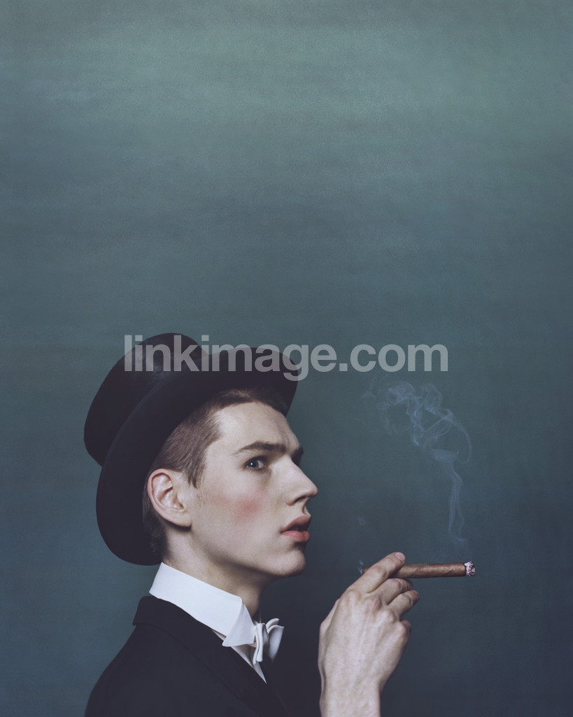 - male, hat, cigar, gaze, tuxedo, fly, smoke, health, profile, portrait, costume, guy, studio, retro