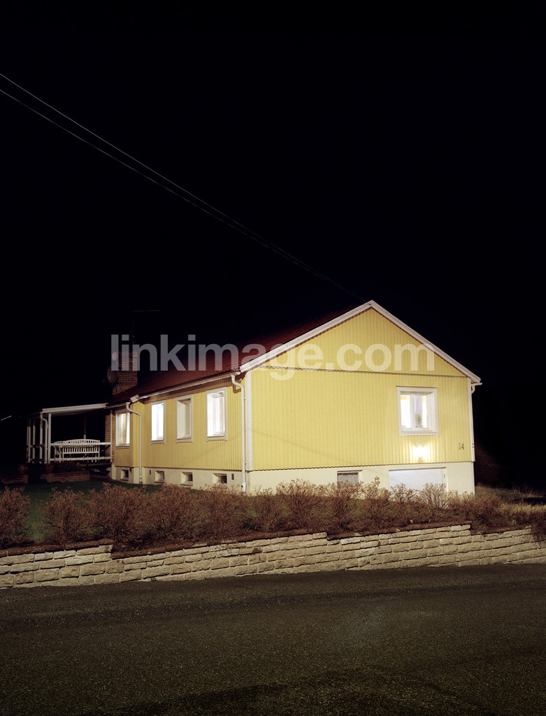 - house, villa, full house, yellow, night, evening, home, wall, hedge, garden, wood, end, single storey, porch, street, suburb, small town, satellite, el, telecommunications, lit, light.