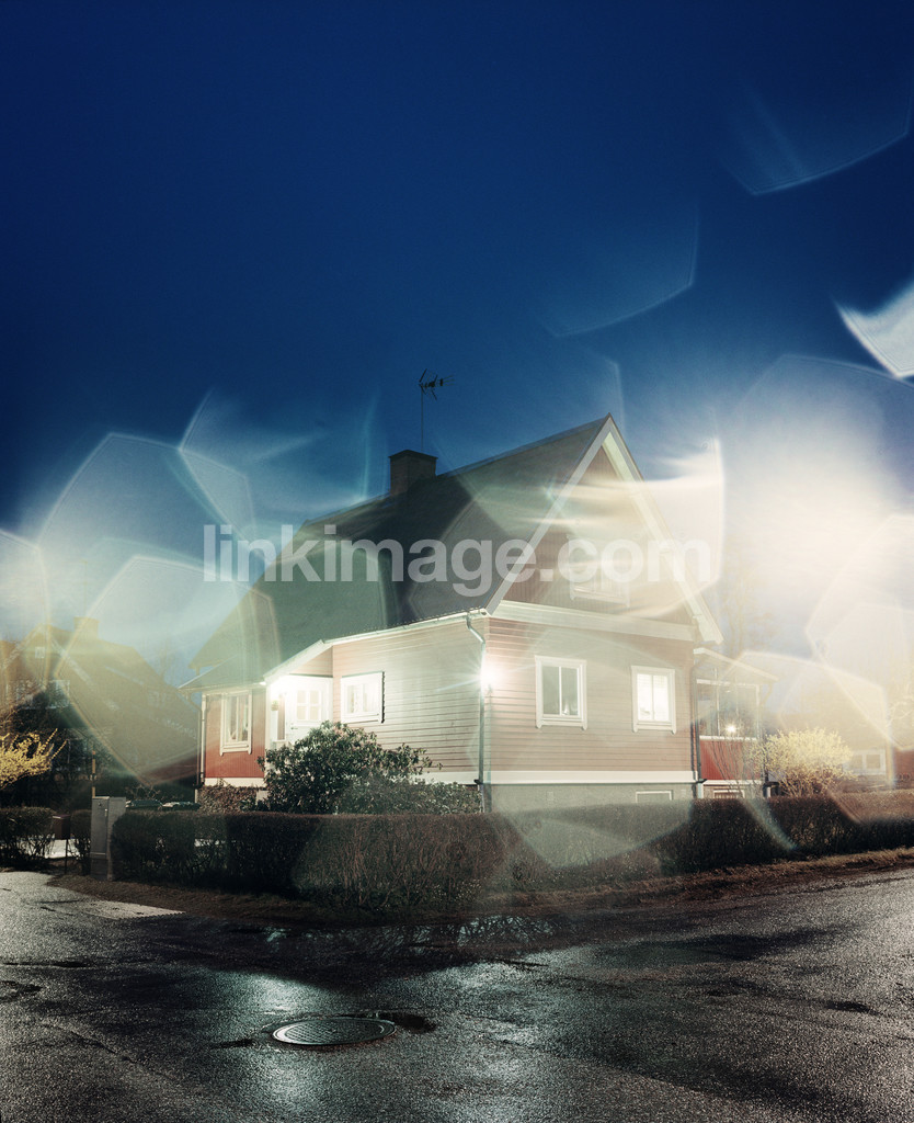 - house, full house, villa, evening, night, home, housing, red, wooden house, panel, rain, storm, wet, street, garden, neighbor, corner, junction, glare, wet, reflex, reflection, dreamy, magic, unreal