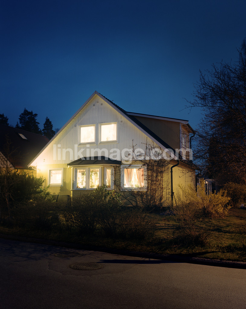 - house, villa, yellow, wooden house, suburb, small town, street, neighbor, housing, home, lit, light, lamp, garden, evening, night, övervåning, oriel