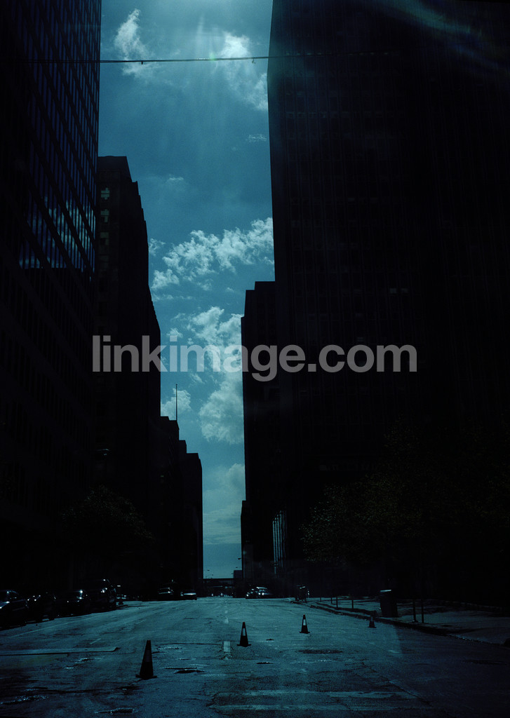 - city, metropolitan, urban, rise, city, concrete, asphalt, street, cloud, sky, backlight, silhouette, contrast, traffic, roadworks, cordoned off, blue