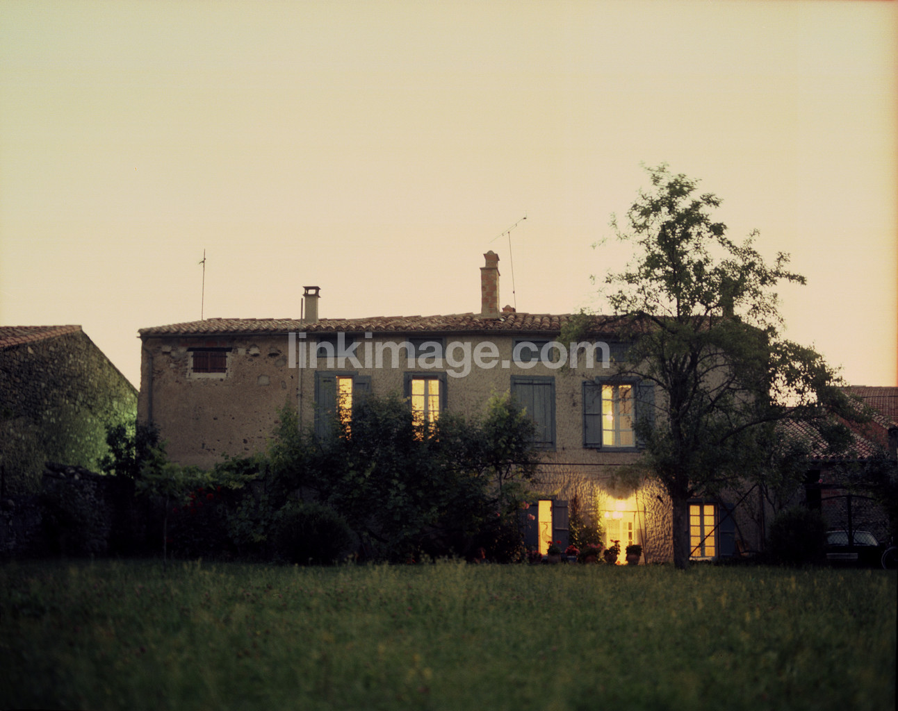 - house, hovel, full house, holiday, summer place, evening, home, lit, shutters, garden, unscheduled, villa, summerhouse, dusk