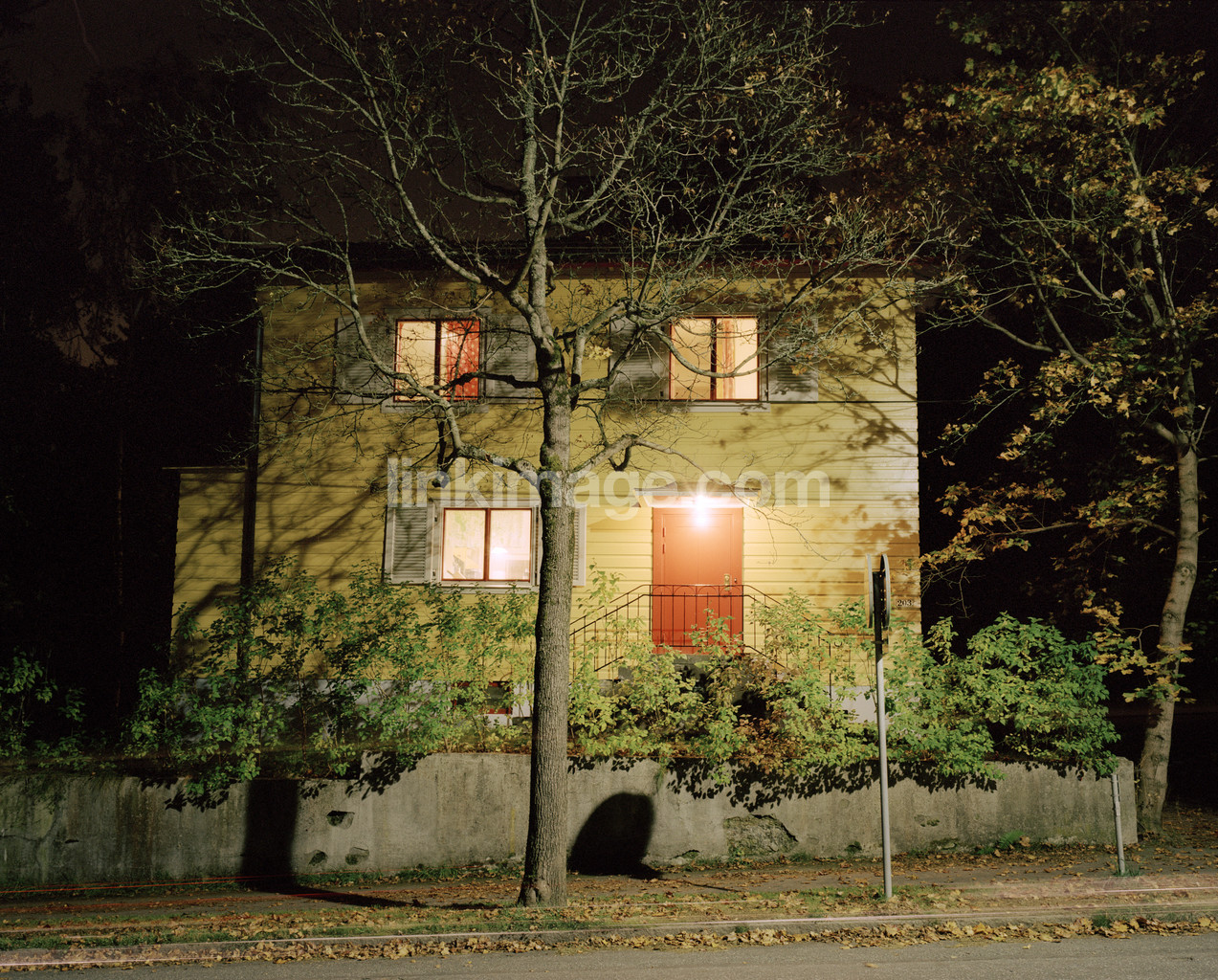 - house, villa, neighbor, street, suburb, small town, yellow, home, lit, awake, tree, garden, streetlights, bromma, evening, fall, hot, safe, wood, pavement, energy, light, housing