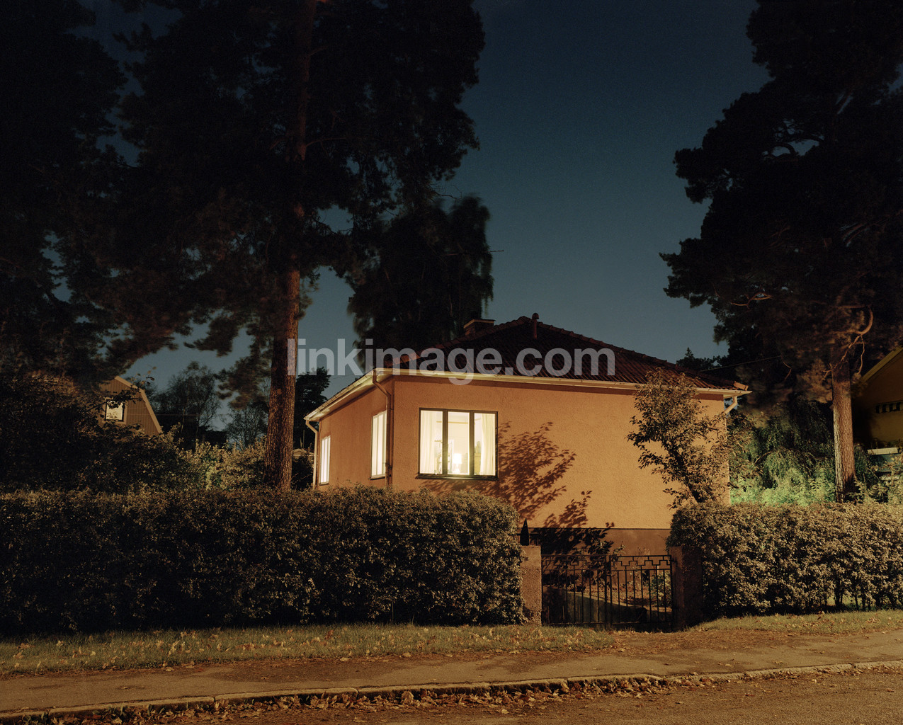 - house, villa, home, lit, light, hedge, garden, suburb, city, small town, night, evening, tree, pine, plastered, gate, neighbor, street, pavement, energy
