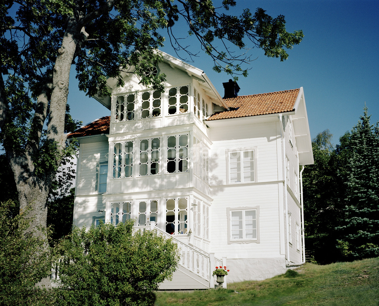 - house, wooden house, villa, recreational home, summer fun, summer place, porch, punch porch, white, summer, sun, holiday, garden, archipelago, dalarö, tree, summerhouse