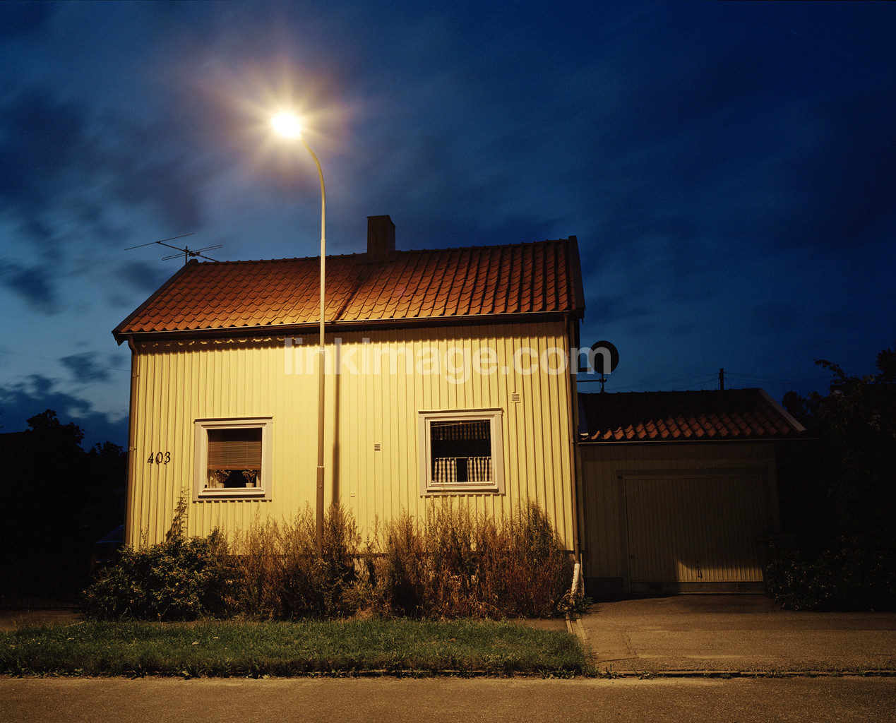 - house, villa, full house, home, wooden house, panel, yellow, night, evening, summer, street, neighbor, out of town, away, locked, satellite, streetlights, streetlight, garage, driveway, park and ride, parking, discount, planting