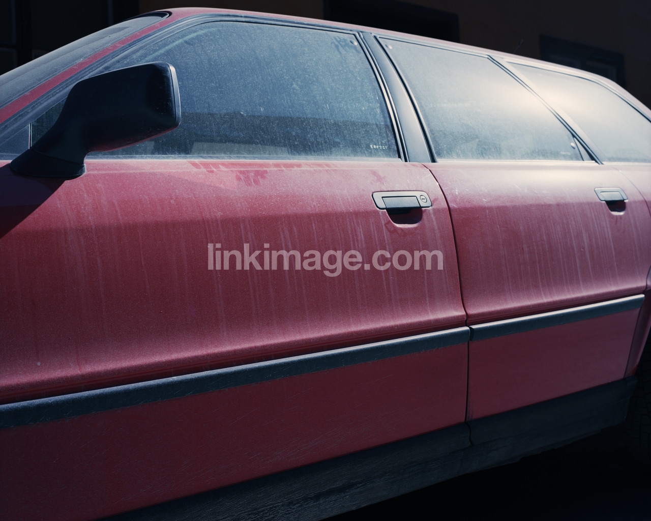 - car, red, dirt, dust, sun, glare, wash, fingerprint, fingers, doors, car door, rearview mirror, box, car window, polish, clean