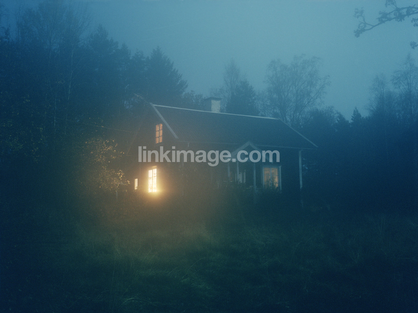 house, croft, home, summer place, full house, white, knots, light, lamp, lit, heat, fall, rusk, evening, dusk, night, dark, country, fog, haze, rat, moisture, chill.