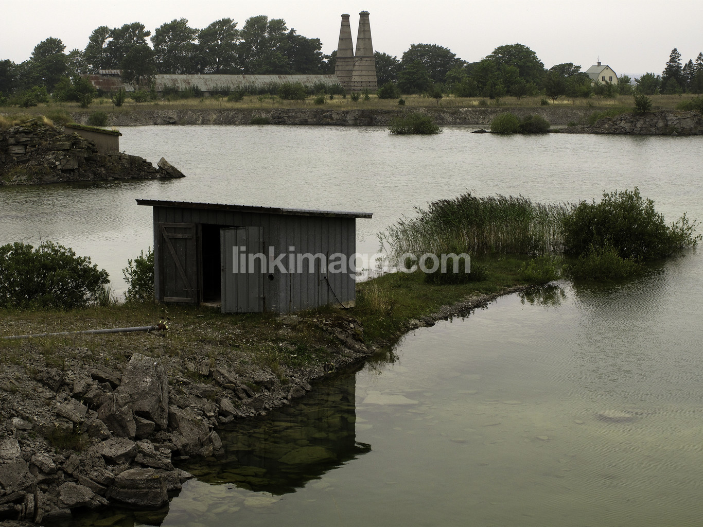 - limestone quarry, water, lake, artificial, spot, view, bod, workshop, plate, shed, plåtskjul, lime kiln