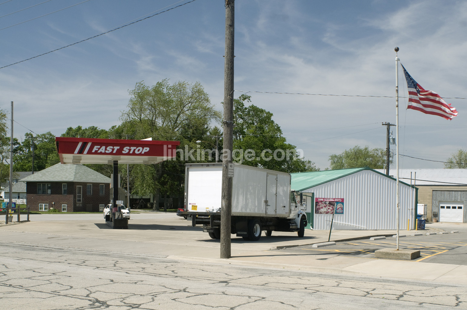 - gas station, truck, buildings, flagpole, flag, usa, tree