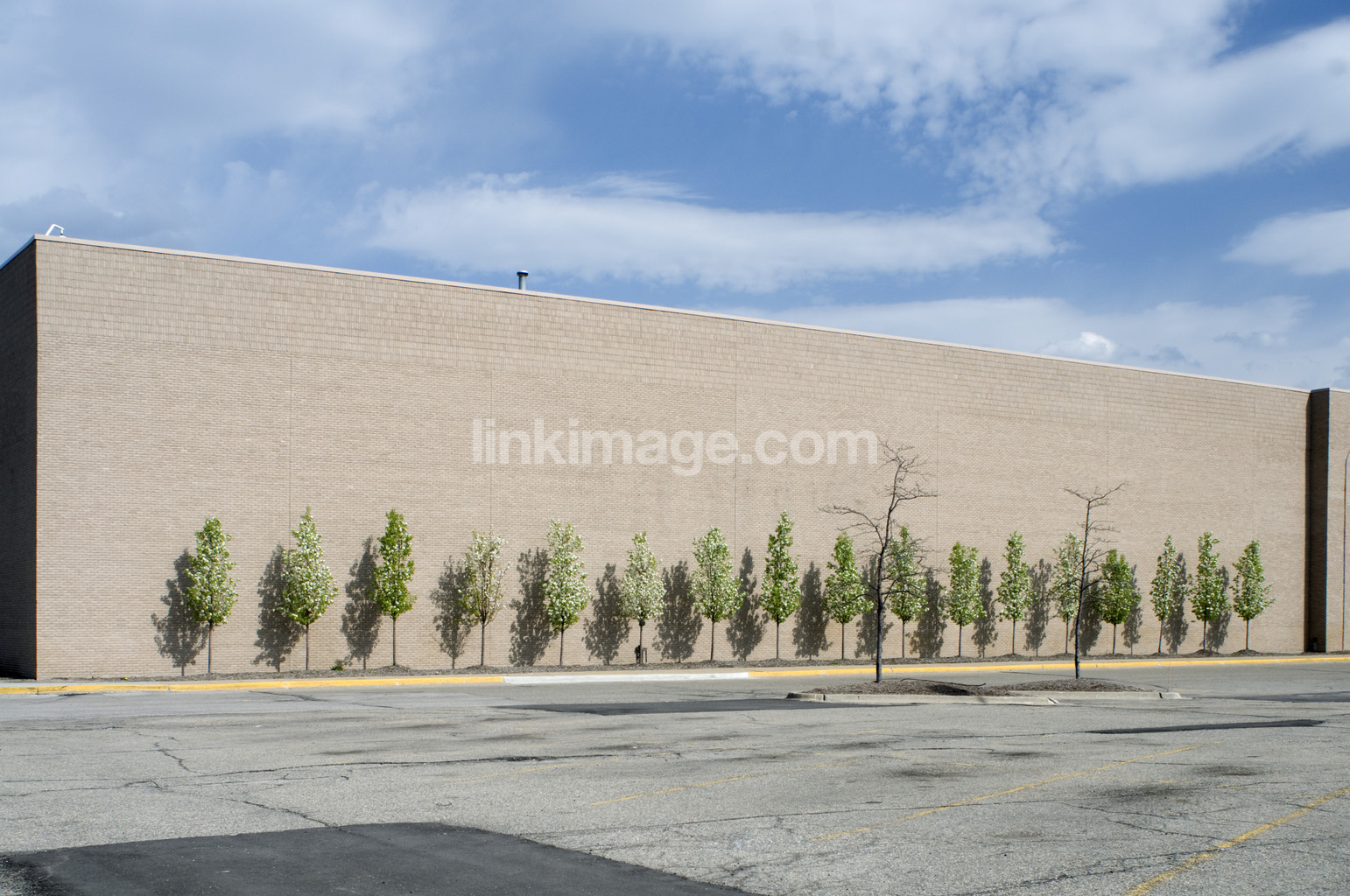 - tree, house, façade, asphalt, parking lot, fate, sky, wall, shopping center