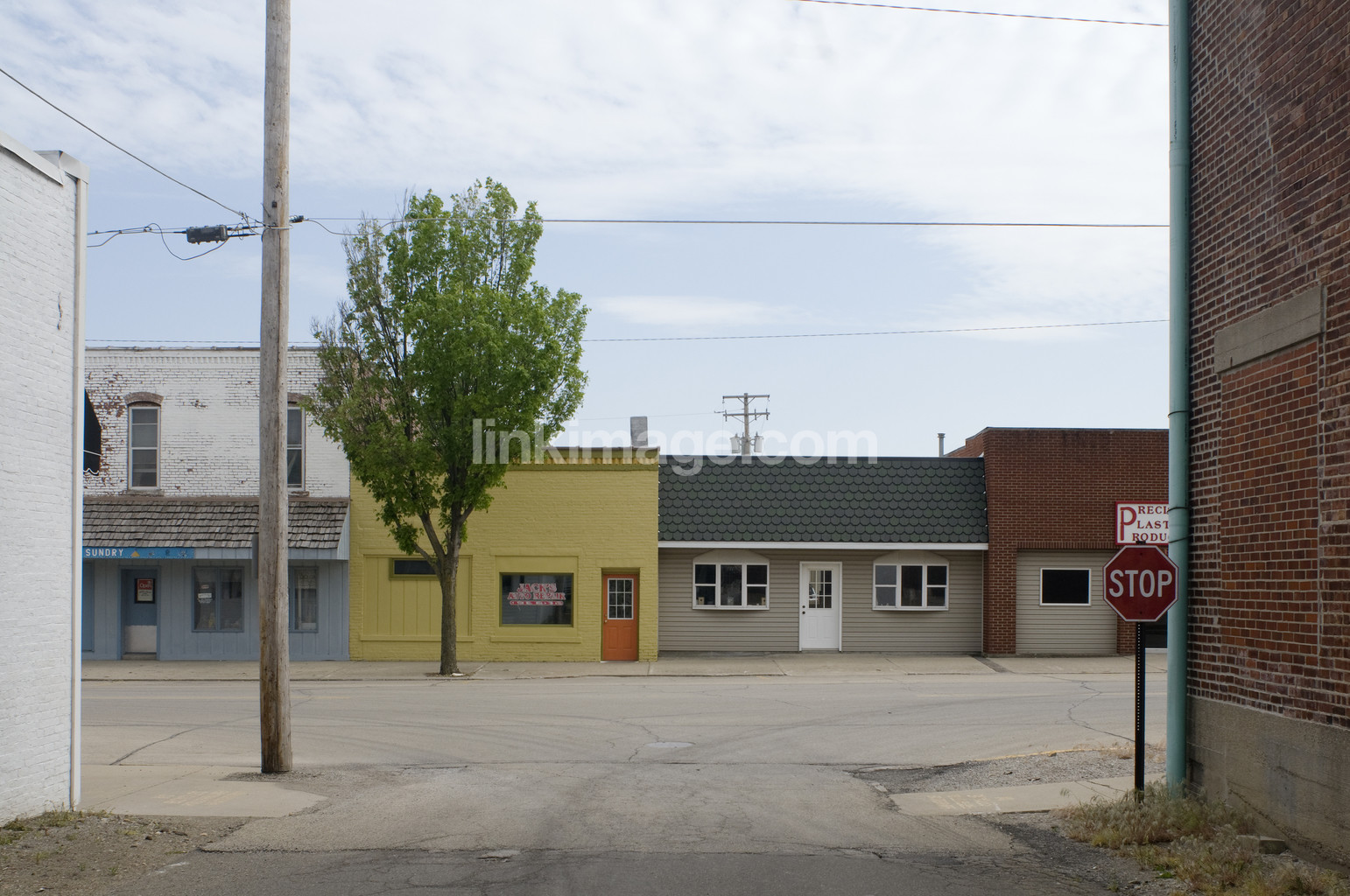 - buildings, junction, tree, sign, stop, electric lines, fate, sky, overcast