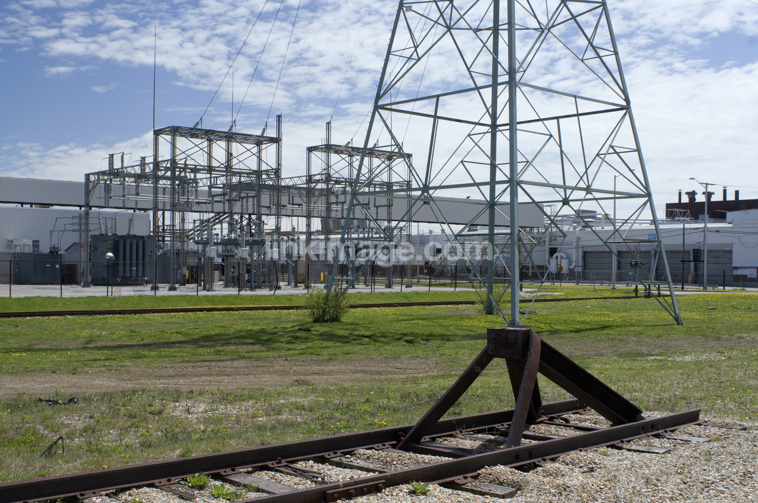 - rail, buffer stop, power station, electric lines, sky, cloud, building, buildings