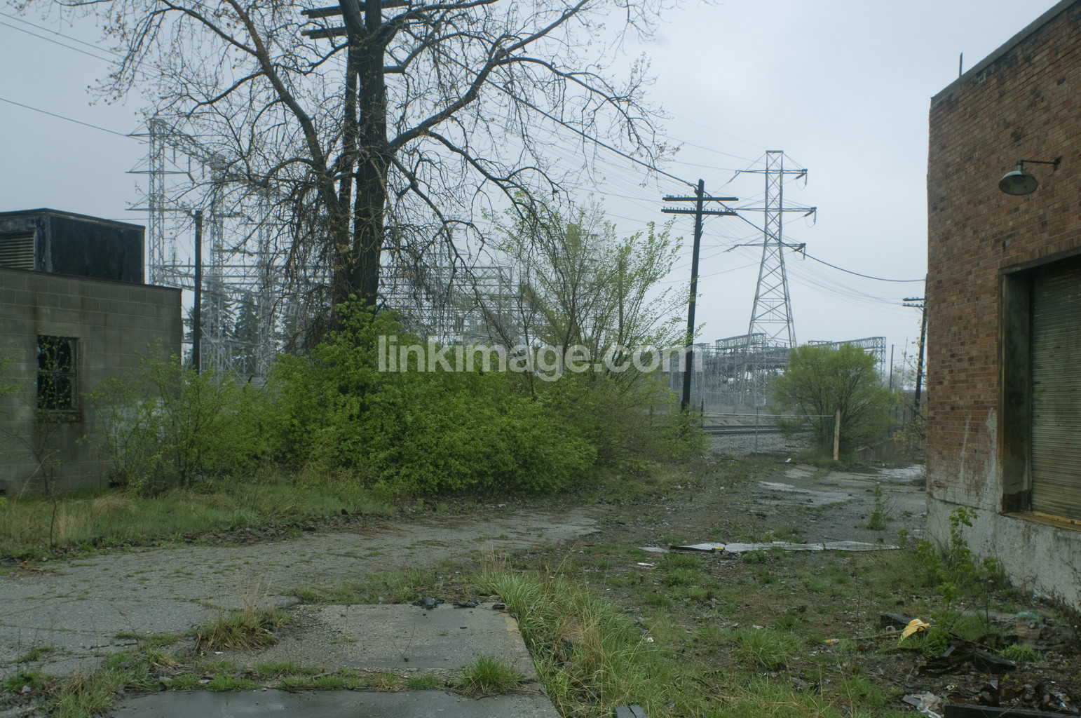 - backyard, worn, bushes, shrubbery, tree, power station, electric lines