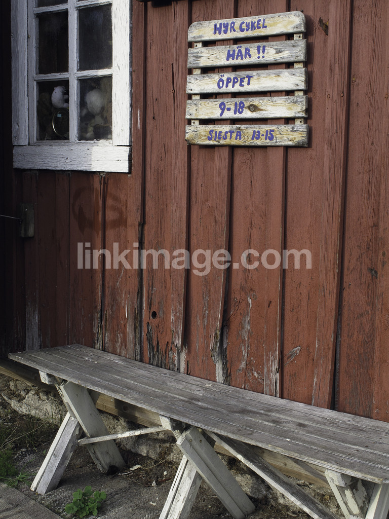 - bicycle repair, country, country built, cottage, red, falun red, bench, sign, open, summer, swedish