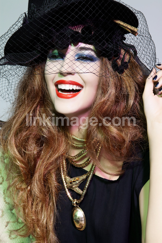 - female, girl, portrait, makeup, makeup, hair, studio, hat, when, necklace, jewelry