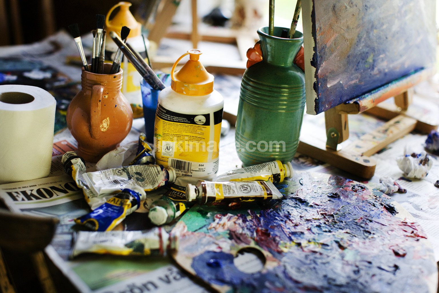 - artist, colors, create, pottering, hobby, easel, window light, brushes, paint, oil, still life