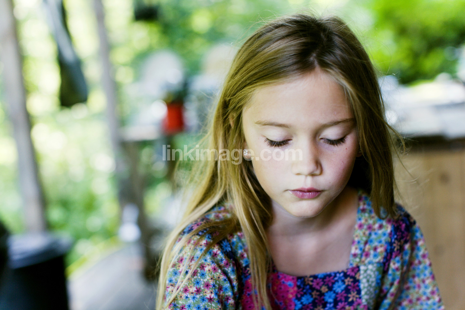 girl, dress, pattern, floral, blue, far, hair, portrait, peeking, porch, concentration, serious