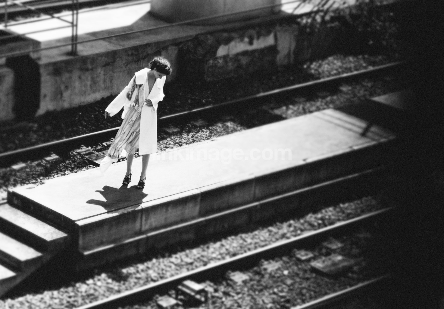 - girl, rail, station, platform, white, dress, staircase, sunlight, female, trip, spring