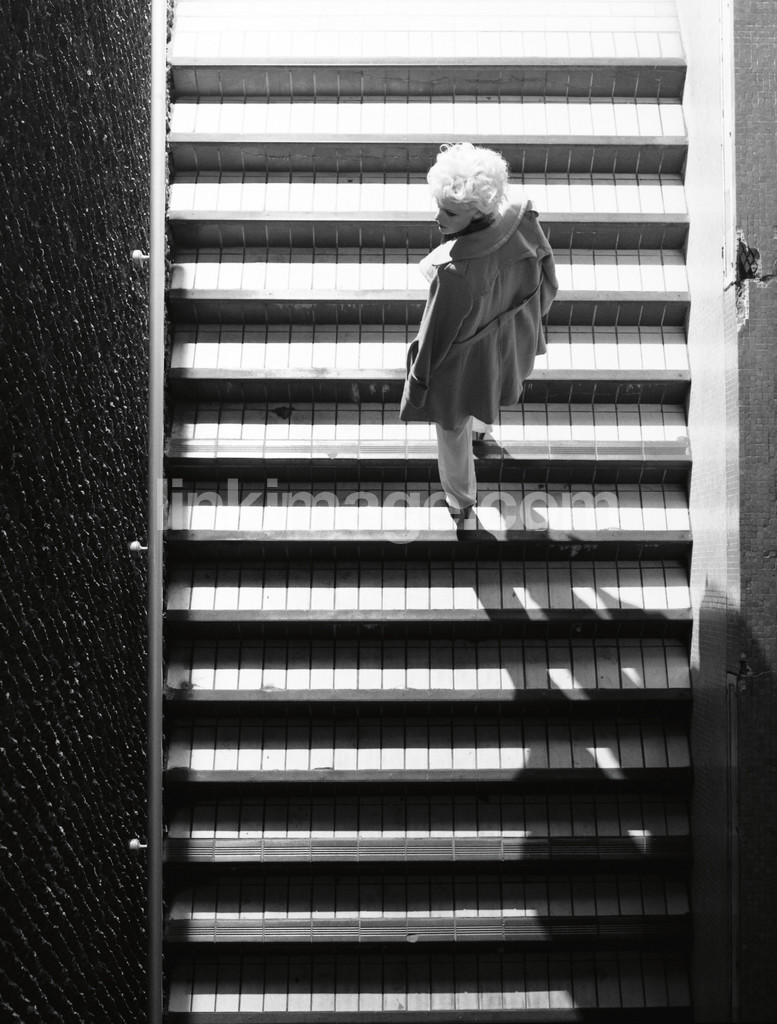 - female, staircase, crack, shadow, white, hair, jacket, kappa, city, urban, light
