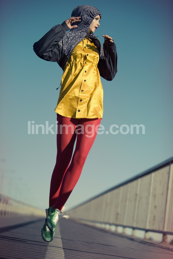 - female, sun, movement, run, girl, portrait, gaze, watch, skipping, bridge, workout clothes, colorful, blue, sky, fence, red, sports, health, exercise