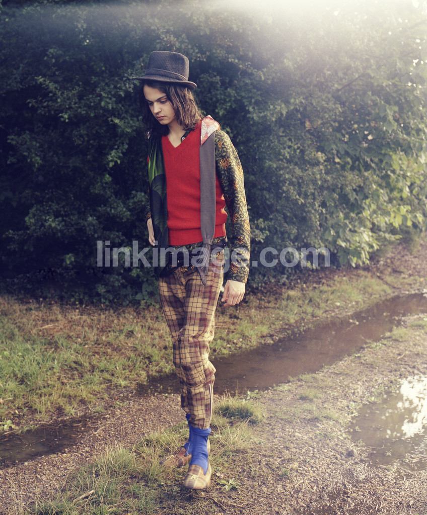 - male, hat, scarf, forest, longhaired, go, drooping, colorful, puddles, path
