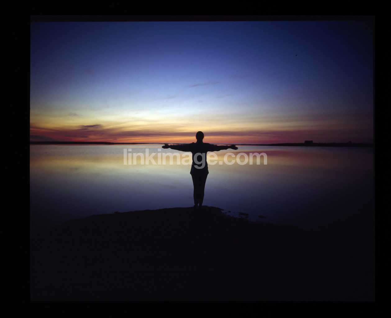 - sunset, silhouette, female, freedom, dream, dreaming, colors, dusk, horizon, graphic, sky, evening, still, sea, water, reflection, blue
