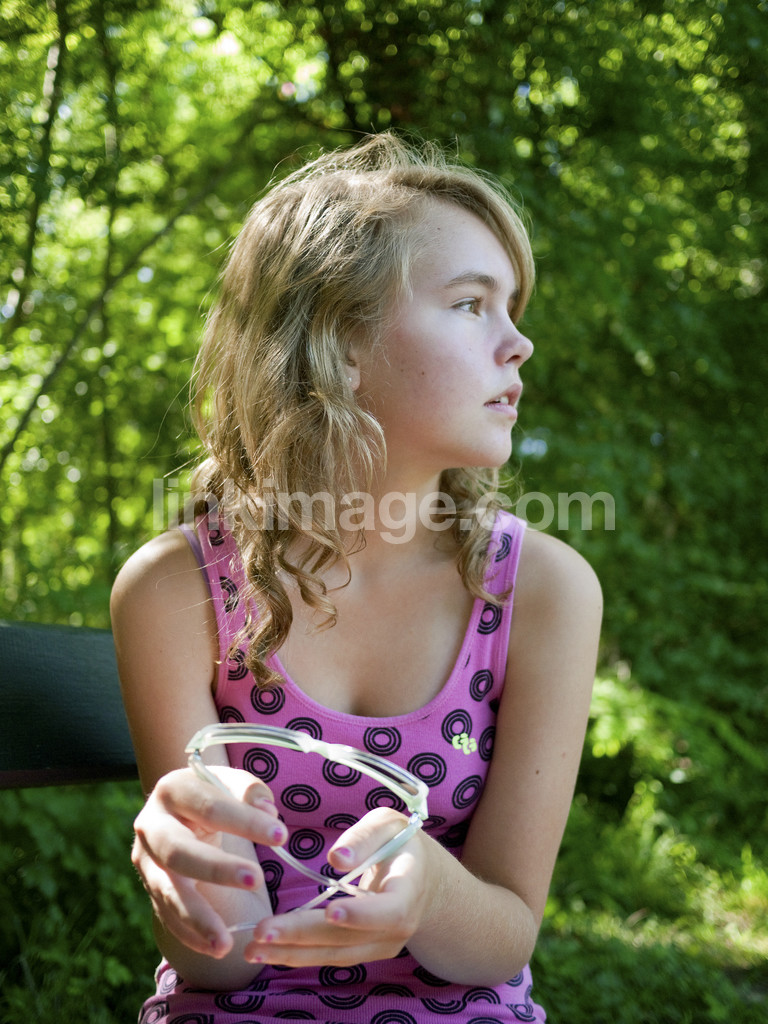 girl, young, teen, profile, face, hair, consider, watch, greenery, portrait, summer, eyeglasses