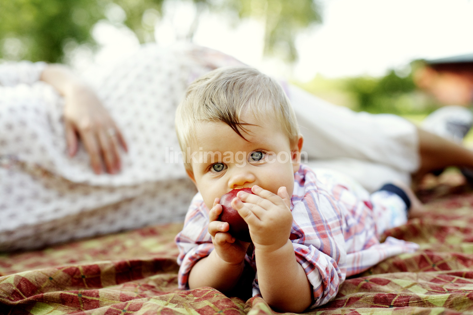 - children, baby, summer, eat, fruits, vitamins, nectarine, c, gaze, serious, enjoying, girl, face, food, good, mouth, eye, hold, grip, mother, blanket, garden, female, family