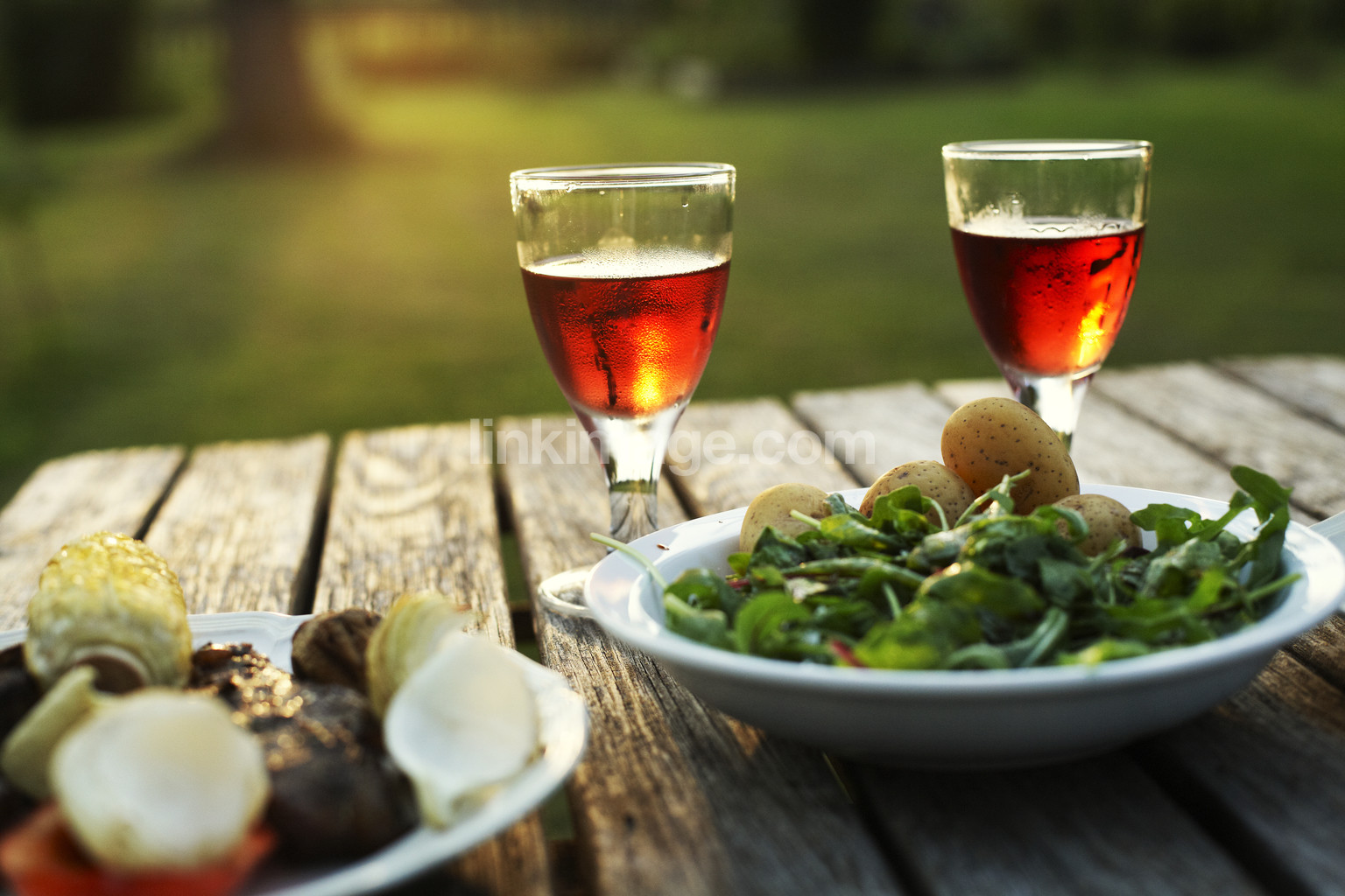 food, wine, salad, meat, potato, glass, plate, summer, evening, dusk, alcohol