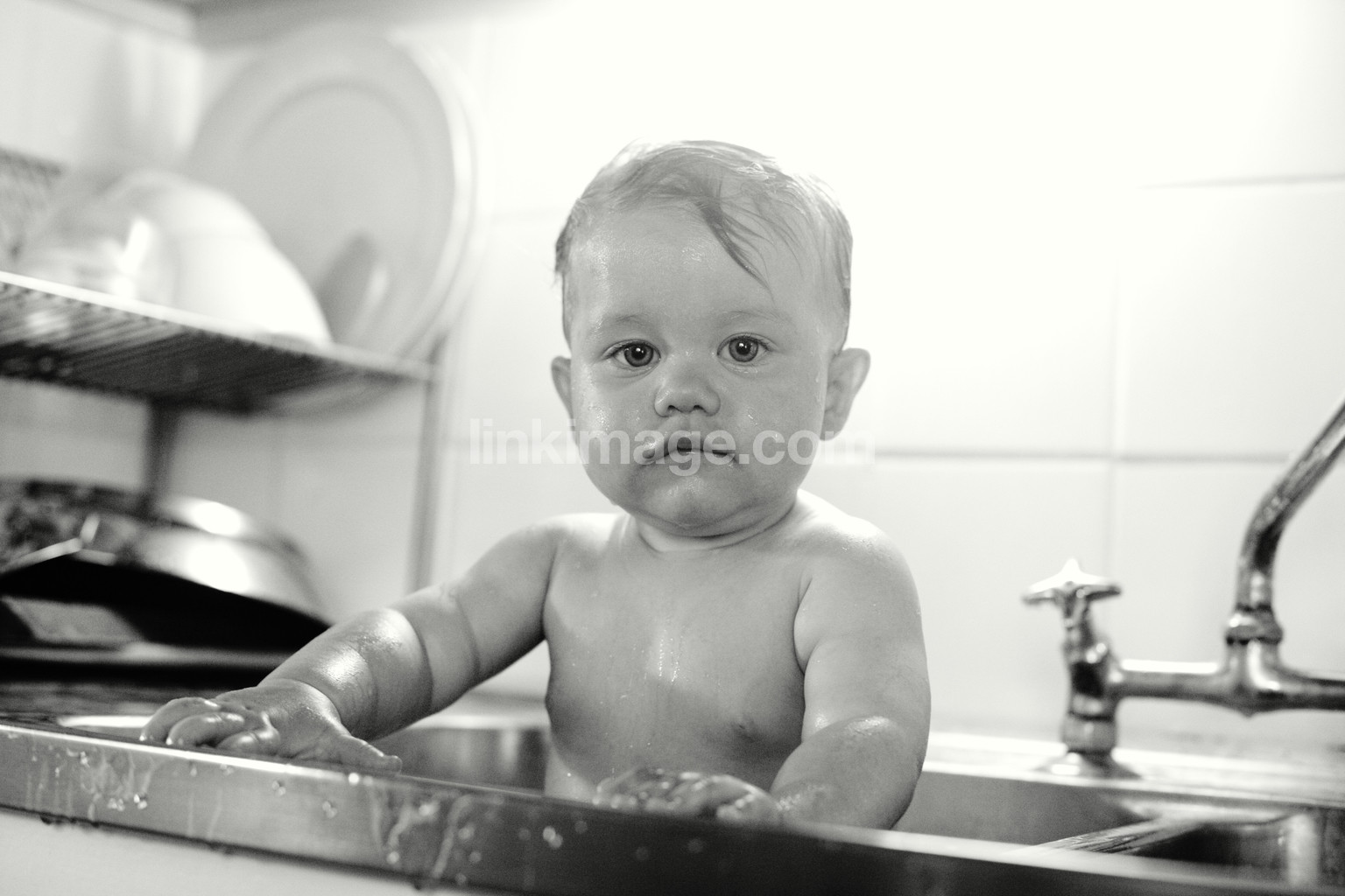 children, baby, girl, swim, disk, kitchen, serious, gaze, wet, clean, wash, face, portrait