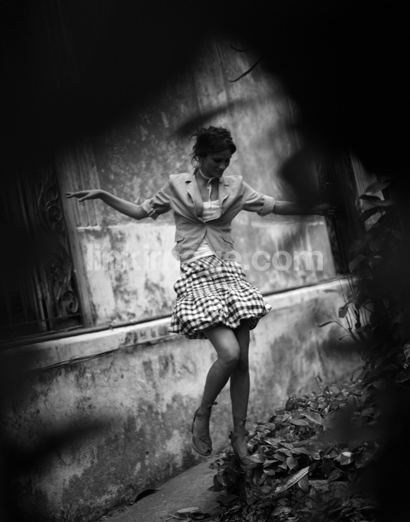 - female, balance, sneak, peeking, foreground, skirt, stand, bone, against, wall, patina
