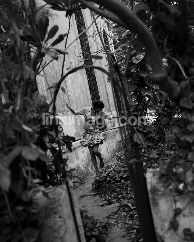 female, balance, sneak, peeking, foreground, skirt, bone, wall, patina, behind, rear wall, leaf, path