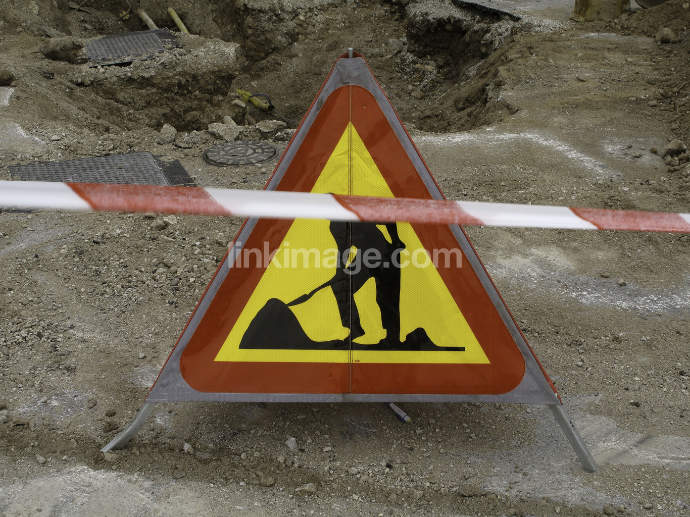 - roadworks, road workers, work, excavation work, heavy, symbol, threesome, traffic sign, warning, enlightenment, anonymous, shovel, yellow, red, pit, holes