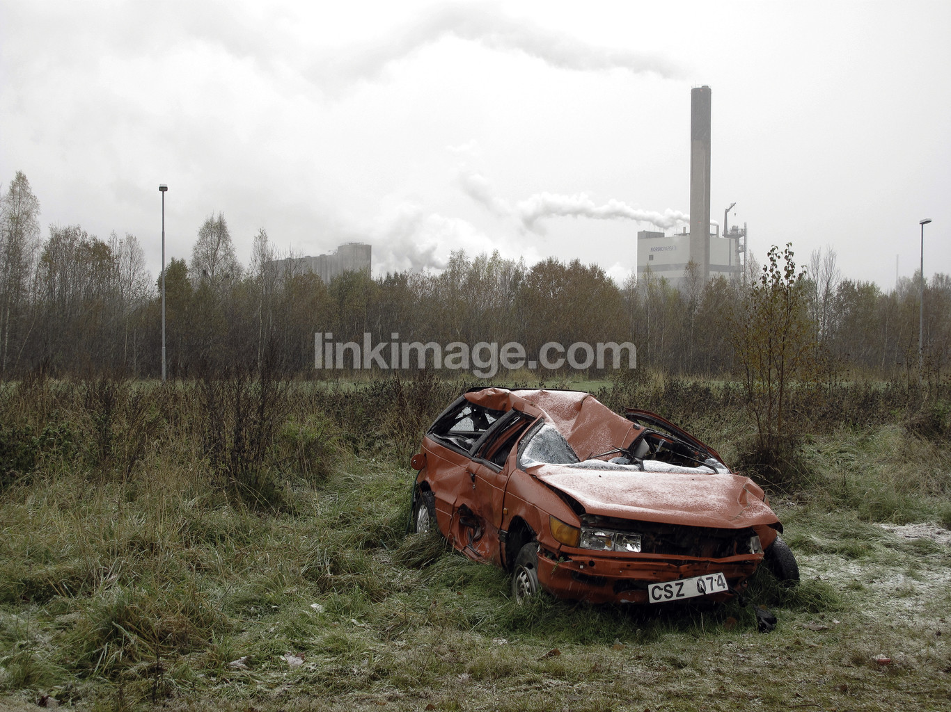 - car, elv, scrap, crashed, red, dumped, pollution, nature, industrial, country, country built, stack, smoke, frost, bilskrot, weather