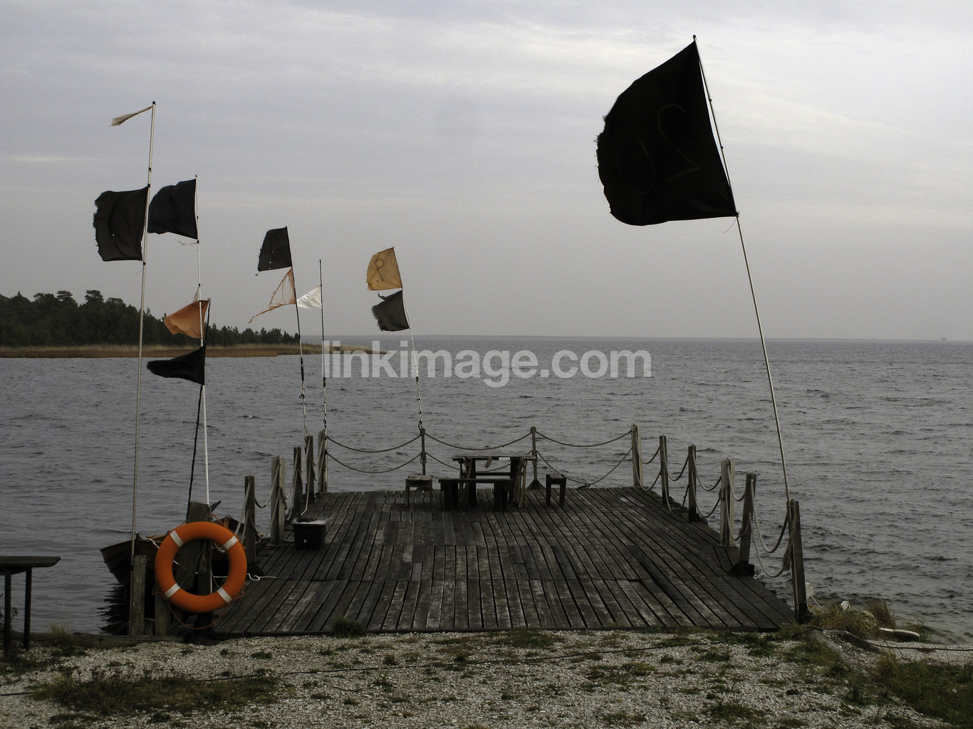 fall, of autumn, weather, blown, bridge, flags, fishing, sea, coast, horizon, terrified, buoy