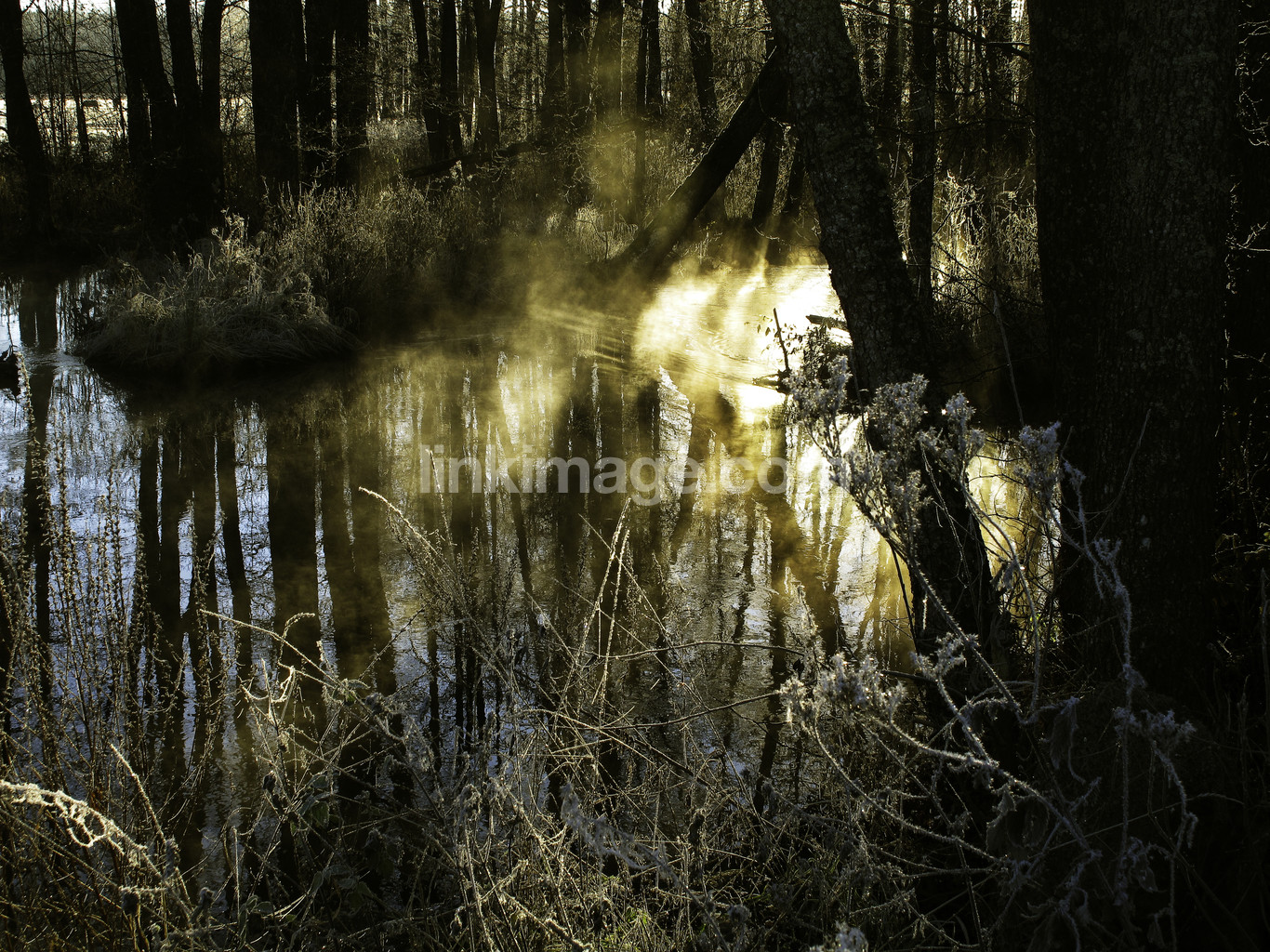 - water, on, stream, light, sunlight, sunbeam, yellow, fog, water vapor, reflection, tree, forest, weirdly, mystery, weather, dew, frost, tree trunks, water mirroring, fall