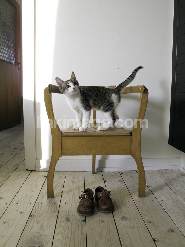 - cat, housecat, chair, children's shoes, sandals, children sandals, highchair, interior, kitten, curious
