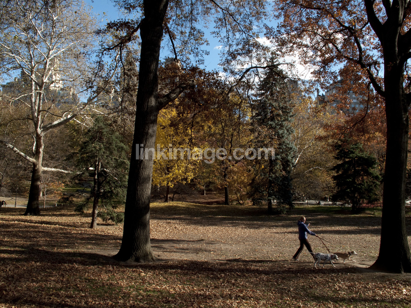 fall, new, york, central, park, leaf, tree, buildings, city, sky, human, dog, pet