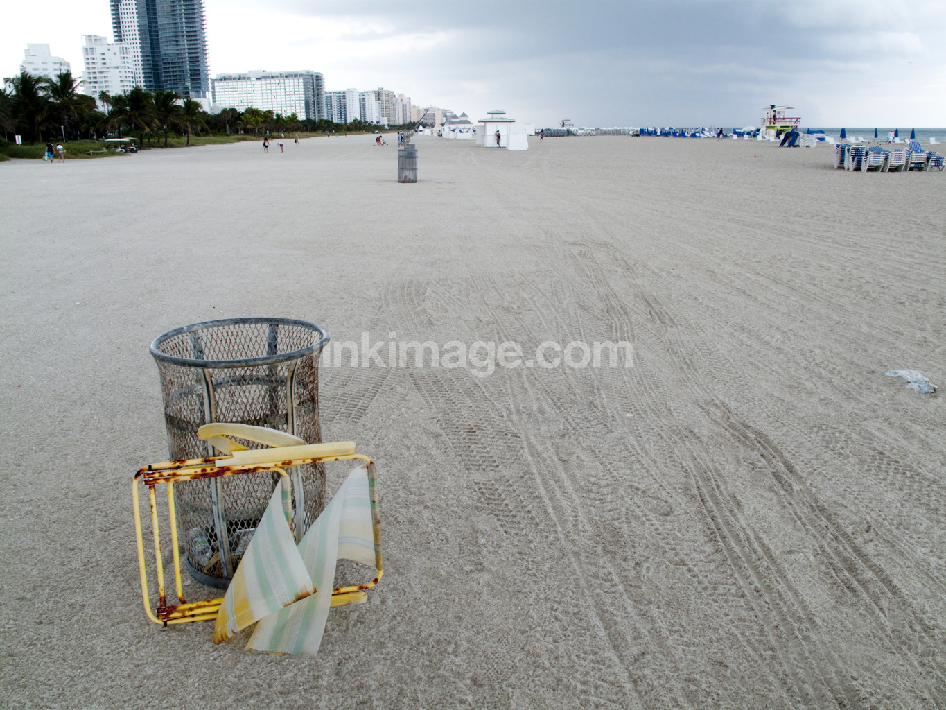 trash, debris, deckchair, shore, sand, rust, rusty, city, skyscrapers, hotel, contrast, track